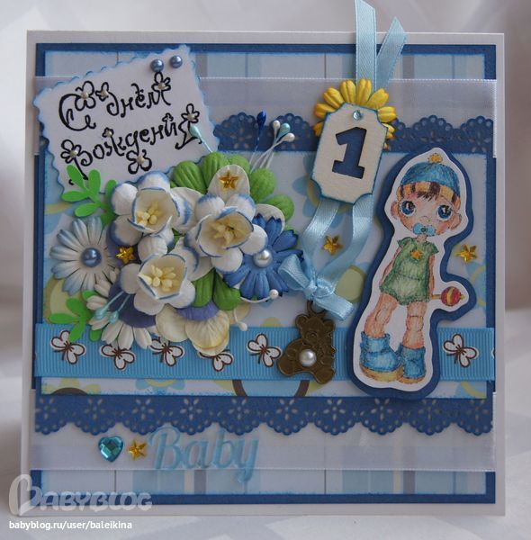 Вот такая получилась у меня открыточка на годовасие мальчика. Да, можно сказать, что перегружена, но вот такая получилась.