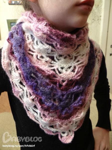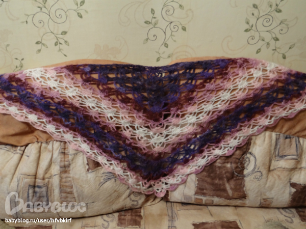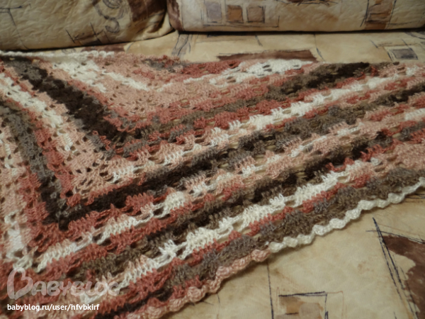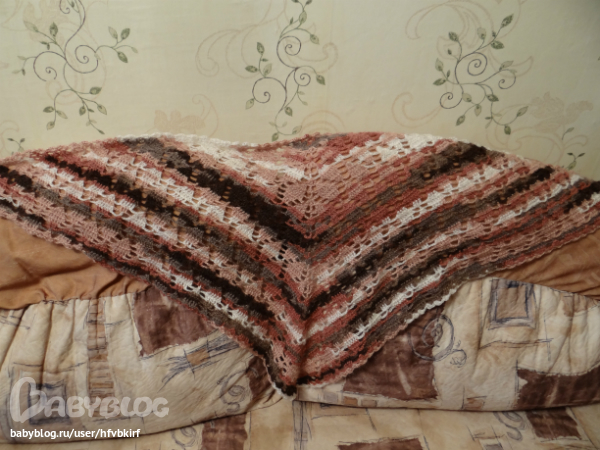 И меня не минула страсть к бактусам-шалькам. Больше всего при вязании секционной пряжей меня увлекает то, как лягут цвета?... Это из Alize Angora Gold.