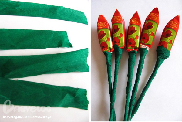 Полоску зеленой креповой бумаги закрепляем скотчем у основания конфеты и, двигаясь вниз по спирали, наматываем туго зеленые полоски бумаги на палочки, не доходя до конца, закрепляем с помощью скотча.