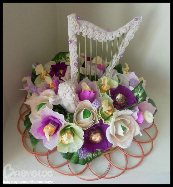 Варианты конфет, их размер и количество – исключительно на ваше усмотрение. Но для начинающих удобнее всего выбирать конфеты, у которых торчат фантики, за которые можно крепить конфеты.