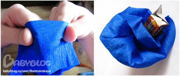 Берем самые маленькие конфетки на зубочистках и начинаем обматывать конфету полоской бумаги, растянутым краем вверх. Отгибаем края наружу, стараясь придать форму распустившегося цветка, у основания закрепляем.