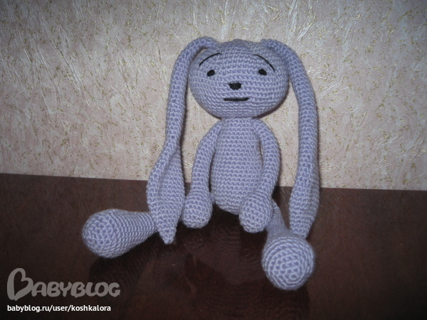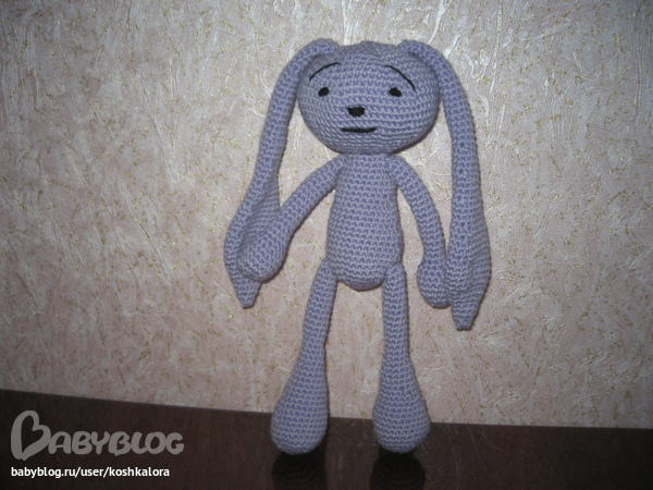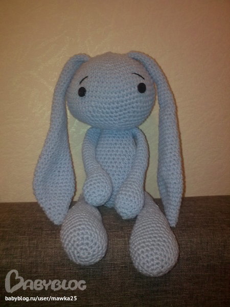 Я тоже недавно такого связала доче, долго в хотелках был, потом взяла и связала за два вечера! Ростом 40 см без ушей. Только без носика и рта, возьму ваш вариант оформления. Очень красивый зайчик получился!!!!