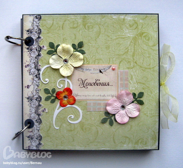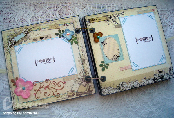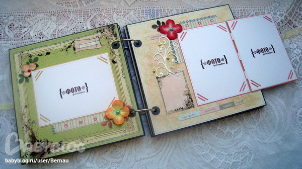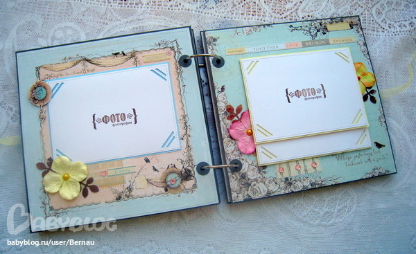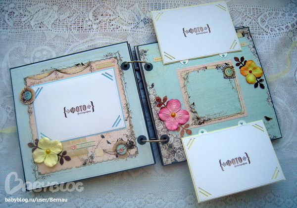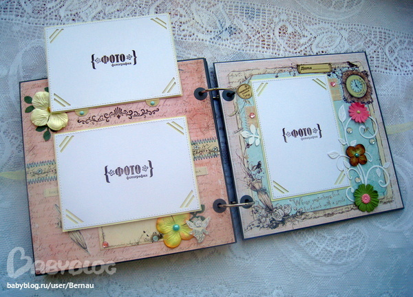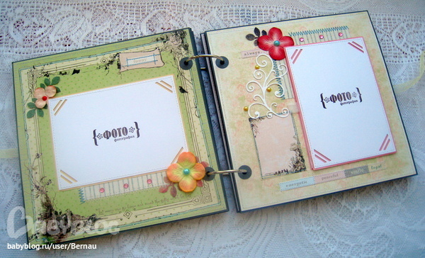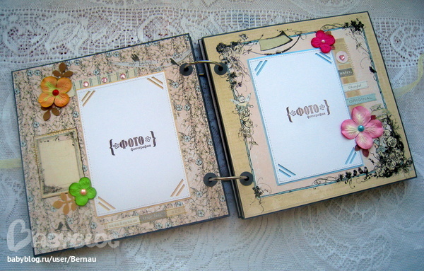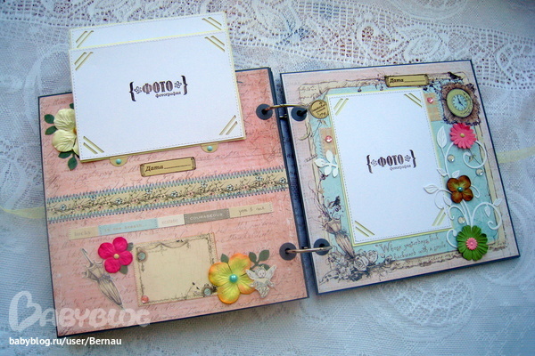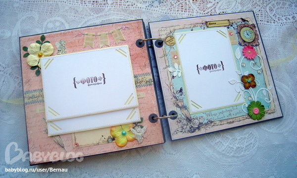 Красивый альбом, но прямо руки чесались все эти цветочки яркие оторвать, ну или хотябы заменить их на более пастельные, в тон бумаге.