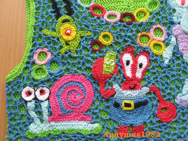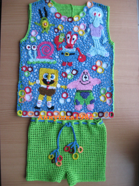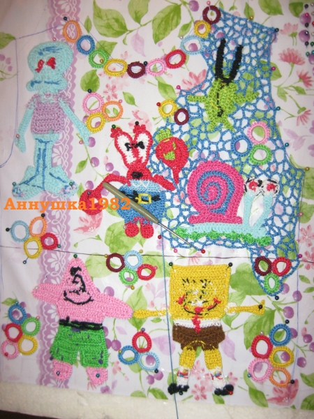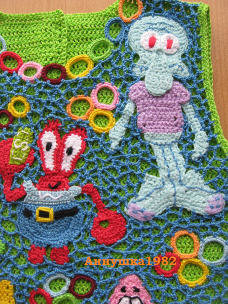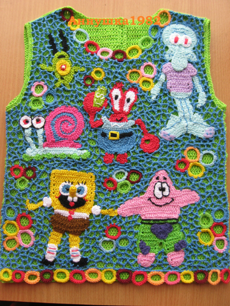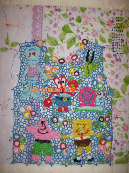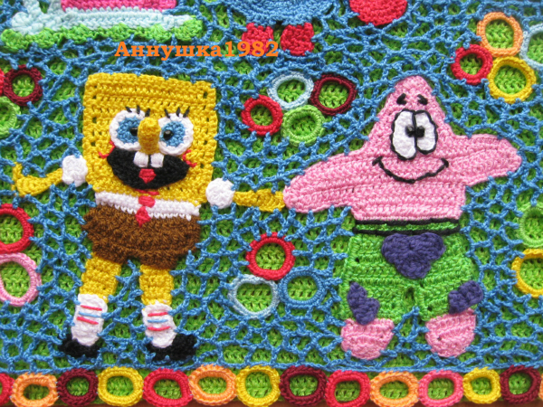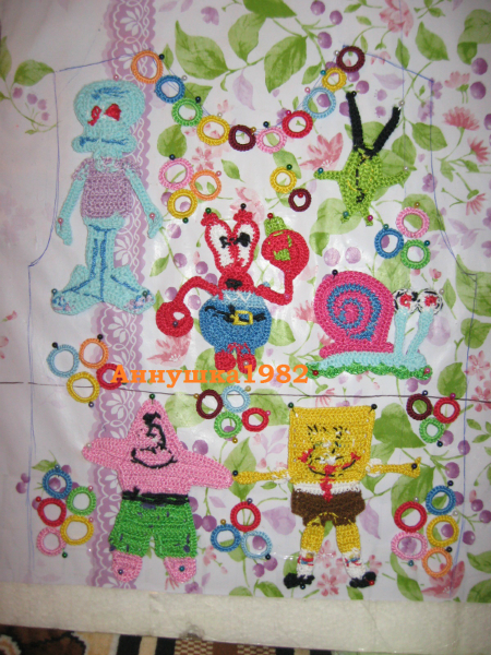 Любит моя Аленка Спанч Боба, ну вот что с этим поделать?! Даже вязать не давала - растаскивала вязанных жителей Бикини Ботом, подходила к выкройке сама ковыряла крючком, такая смешная. Теперь осталось связать беретик в этой же тематике.