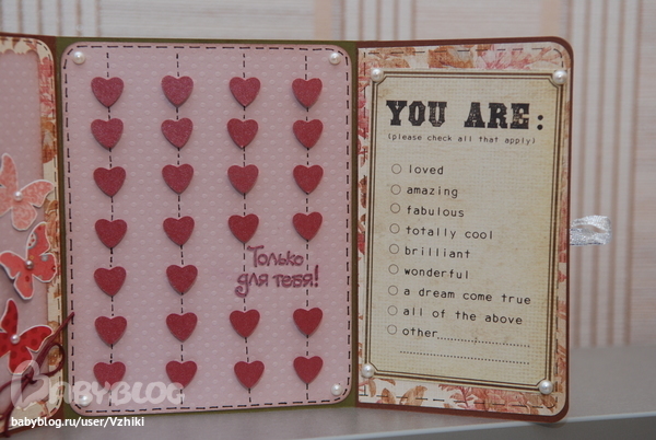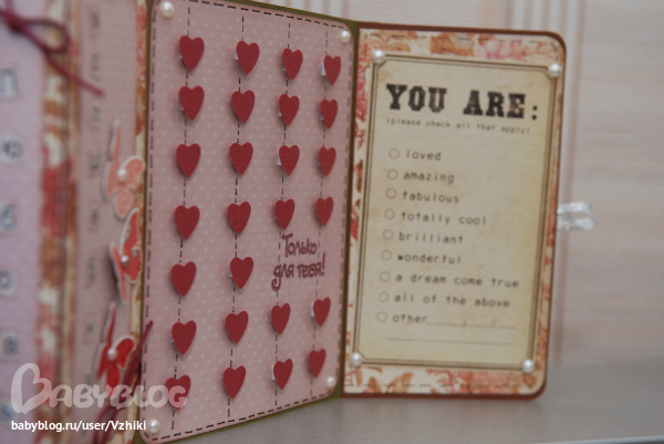 левая сторона с тегами, которые вынимаются из кармашка и на которых можно написать историю знакомства, послания, слова любимой музыки и просто приятности)