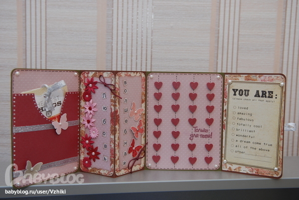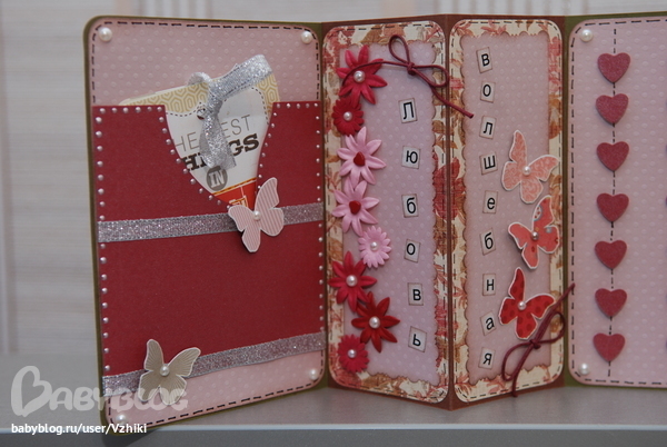 Вот что у меня получилось, исходя из пожеланий заказчицы: чтобы раскрывалась, много сердечек, кармашек, и можно было самостоятельно написать что-нибудь приятное. Идею подглядела на Но так как подарок для молодого человека, то идею сумочки трансформировала в объемную открытку. Но идея мне очень понравилась)