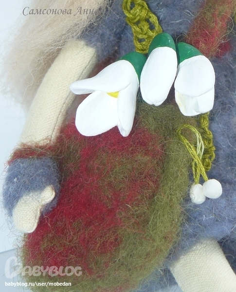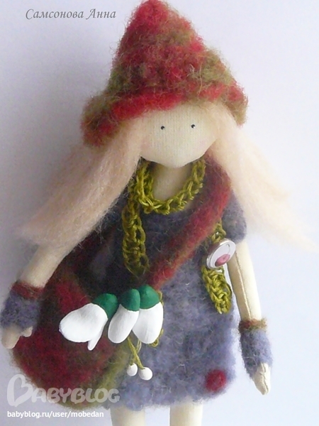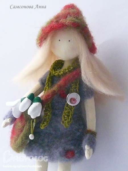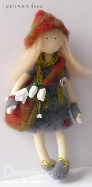 Девушка сотворена при помощи смешанных техник. Тело сшито из бязи, наполнитель холофайбер. Волосы - 100% шерсть меринос. Платье, валеночки, митенки, шапочка привалены (шерсть 100% кардочес (Германия) - серый, зеленый, красный.) Шарфик связан крючком вручную из ниток хлопок. Сумка сваляна из 100% шерсти кардочес (смешение трех цветов). Подснежники слеплены вручную - проволочная основа, пва, паперклей (Paperclay Creative), акриловые краски.