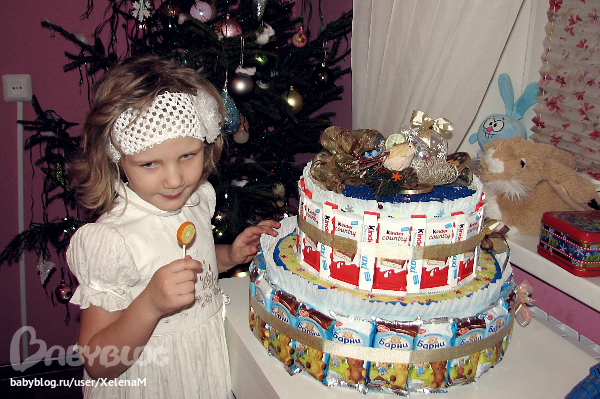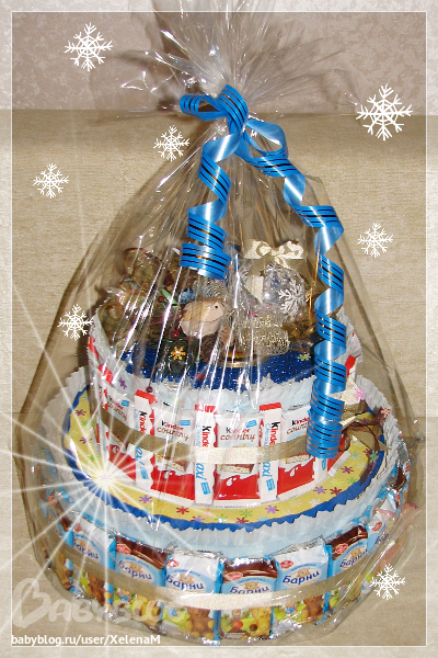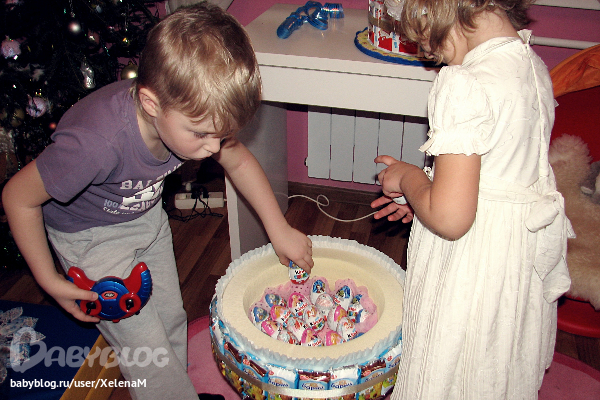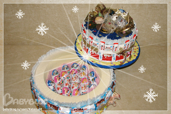 Тортик открывается, а внутри киндер - сюрпризы 24 шт (12 для мальчика и 12 для девочки), можно конечно их красиво обернуть , но времени уже не оставалось)))