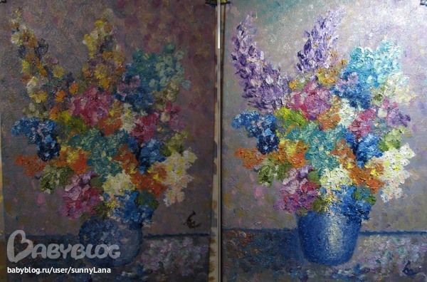 Живопись, точечная росписьВчера вдохновленная похожей композицией написала что-то свое на эту тему.. опыт рисования очень небольшой, но я первый раз делала это с огромным удовольствием, не вдаваясь в нюансы и детали, которые рисовать не умею, в общем, творила для себя.. для моей буйной цветочной абстракции даже ваза стала мала)) закончила..подписала..рисунок слева.. но вдруг в 4 часа ночи у меня включилось левое полушарие и я начала все править..в итоге получился рисунок справа.. а надо было исправить только вазу.. эти цветные веселенькие "рога" сверху на левой картине мне грели душу и радовали глаз)