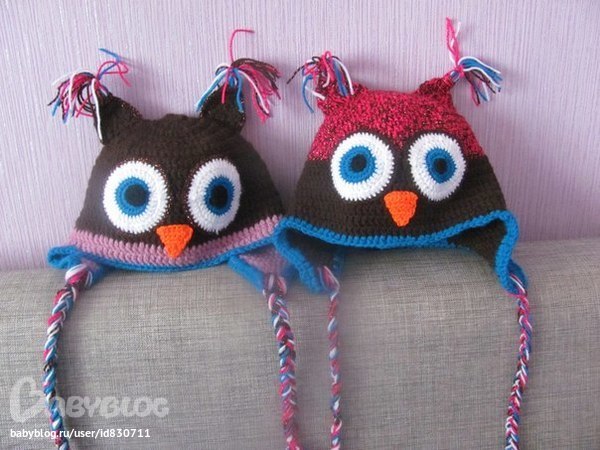 Вот таких совушек связала дочке и племяннице на весну! Не судите строго: это мой первый опыт вязания шапок, а крючок я последний раз в классе седьмом на уроке труда держала)))