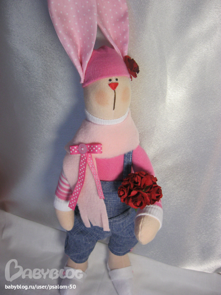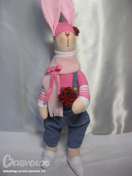 Такой моднявый))!Просто блеск)Ему еще можно было будто наушникой что-нить сделать)Вообще тогда супер пупер)))НО правда этот Зая с цветами очень милый))!Какие тыщи...все 2, а то и больше!!!!!! Светочка Вы мастерица!!!!!И все у Вас получилось!!!!!!!!!!!!А мы и не сомневались!