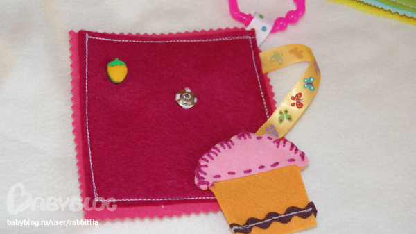 Можно использовать эту книжечку в любом возрасте. И рассматривать и трогать все позже растягивать и пристегивать , плюс она очень красочная. Пуговки трогать пальчиками крутить их ( мелкая моторика) а позже и счет можно ввести.