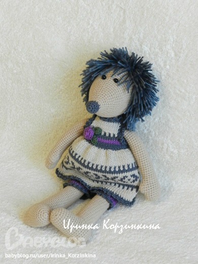 Вот так! Хотела связать ёжика-мальчика, лапки закрепить на пуговичках, одеть штанишки, свитерок. Оказалось, что зверюшка против))). В итоге - игрушка цельновязаная. Сидит, стоит с опорой. Наряд летний (подчинилась грубой силе колючей разбойницы). Размер - 30 см. Материалы - хлопок с акрилом, хлопок, полушерсть. Вот такая она получилась...