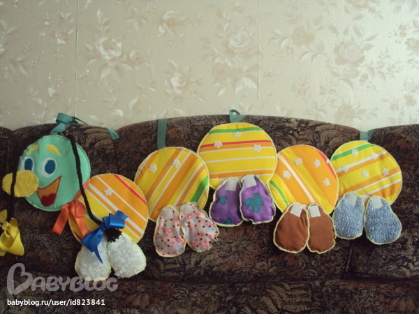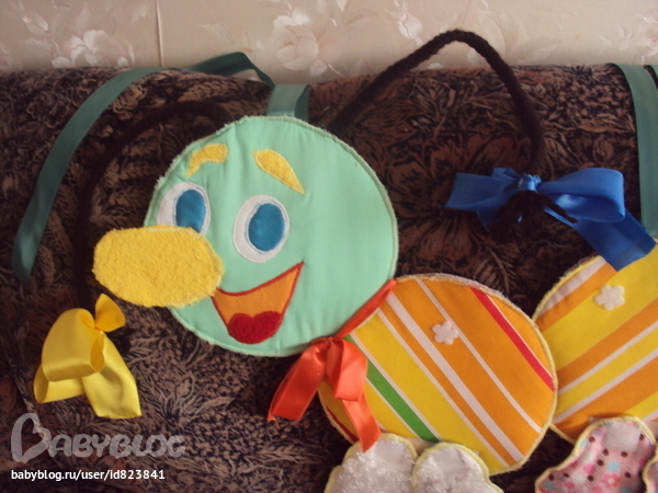 В трех кругах кармашки. Нос и бровки из махровой ткани (эх,не додумалась тогда пищалку зашить), рот из искусственной кожи, косички из пряжи, ленточки можно развязывать. К гусеничке прилагались 8 пар ножек (на фото только 5 поместились), причем с обратной стороны они другого цвета. Внутри лапок разные наполнители. Крепятся лапки на липучку. Еще липучка в виде цветочков пришита к самим кругам. На первом один цветочек, на втором - 2 и т.д. К этим липучкам можно прикреплять бабочек, цветочки, ягодки и всех, кто хочет на гусеничке покататься и имеет с обратной стороны колючую часть велкро.