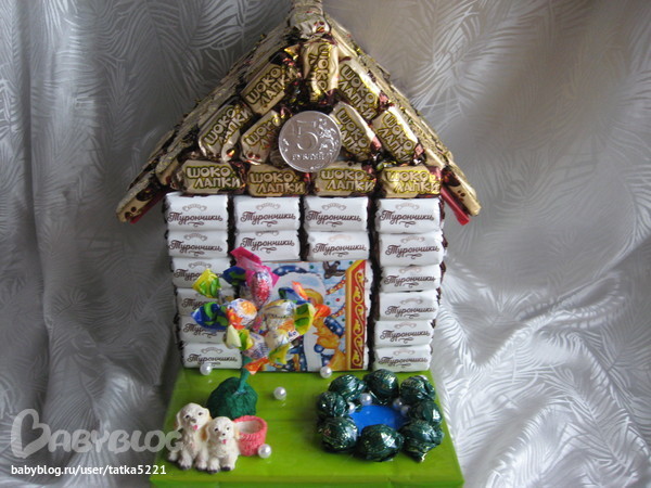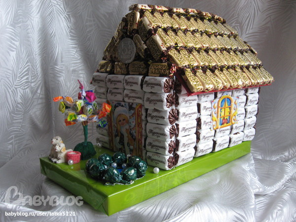 Такой домик построила. Ушло более 2 кг конфет . Получился внушительных размеров. Конфеты "Шоколапки" - 118 шт, "Турончики" - 108 шт., "Пикколо" - 15 шт., "Шарлетт" - 8 шт, Монеты - 2 шт. + коробка конфет "Бабаевский Ассорти" в качестве основы . Вес композиции чуть более 2,5 кг.