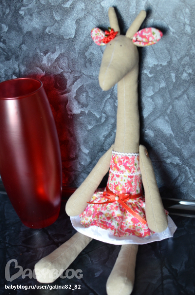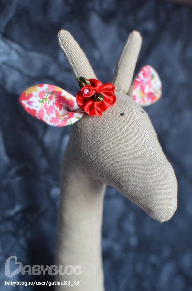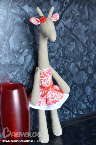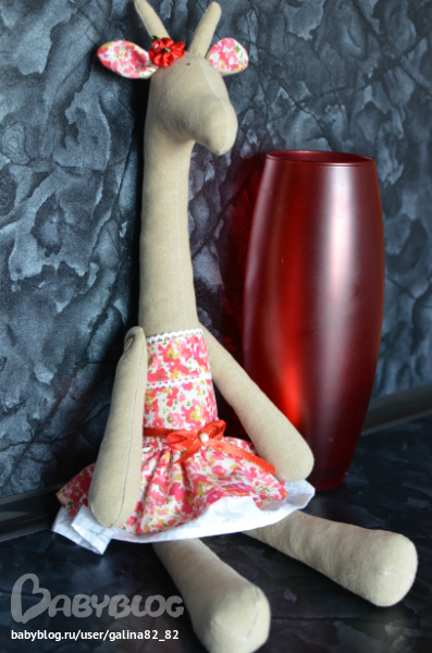 Вот, почти за два ребенкиных дневных сна сшился вот такой чудный жирафик, вернее жирафиха. Ростом вышла 54 см. И все же не нравится мне эта набивка для такой ткани, небольшой эффект целлюлита присутствует, особенно при жестком свете как на фото. На флисе совсем этого косяка не видно. Фото ниже: