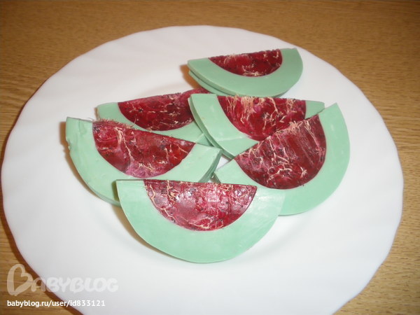 Поздравляю с почином:) добро пожаловать в мыловары:)!!! Арбузик и сырок очень нравятся:)