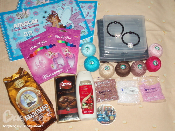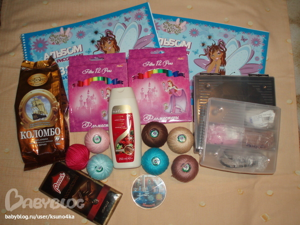 Ну, и вот так выглядела посылочка в полном составе! Женечка положила моим красавицам по альбому и фломастерам! Как хорошо, что всем досталось по одинаковому сюрпризу! Не пришлось ничего делить "по-братски" между сёстрами!)))) От моих девчонок отдельное спасибо тебе,Женечка, за альбомы, фломастеры и замечательные резиночки!!!!! Они рады и счастливы!!!!!