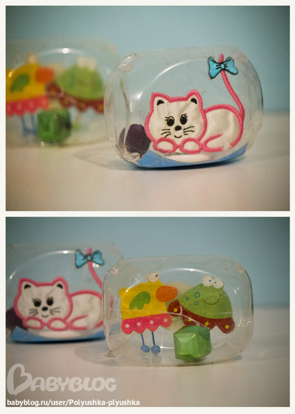 Эти погремушки-гремелки я делала, еще для Плюши, когда ей не было и года.Плюша их пользовала очень активно, не смотря на это, они благополучно дожили до наших времен и переданы Федюне по наследству. И он их любит. Даже Плюша, иногда ими до сих пор играет. Для этого мне потребовалось: две обыкновенные коробочки от сосок Авент, скотч, пуговка, две бусины, два деревянных стикера "уточка и лягушка", тканевый рисунок "котенок" и 10 минут свободного времени. Наполнение может быть каким угодно, лишь бы громче гремело при встряхивании.