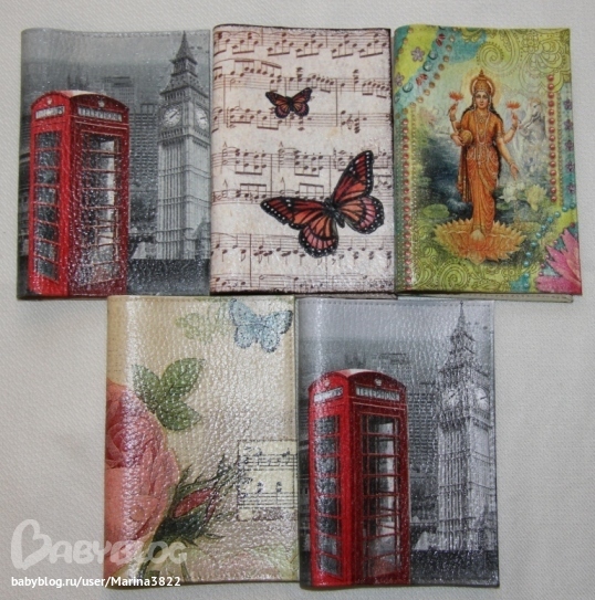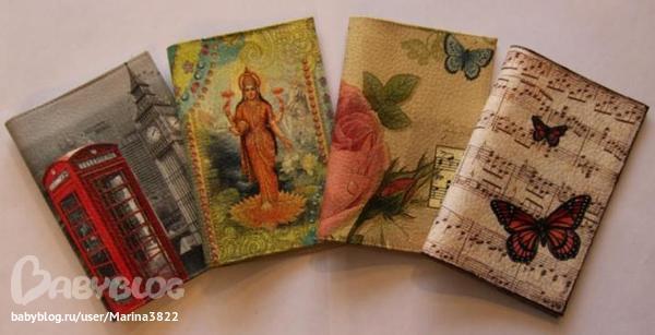 ДекупажДавно ничего не делала и даже забыла как это ))). Нееет, надо регулярно (хотя бы периодически) набивать руку и заставлять голову работать в нужном направлении. Иначе сижу потом и не знаю с чего начать (. Если бы не пообещала родным, что сделаю для них обложки, то так бы и взялась за них, но сделала с небольшим запасом (в конце понеслось само собой ))))). Вот что вышло.