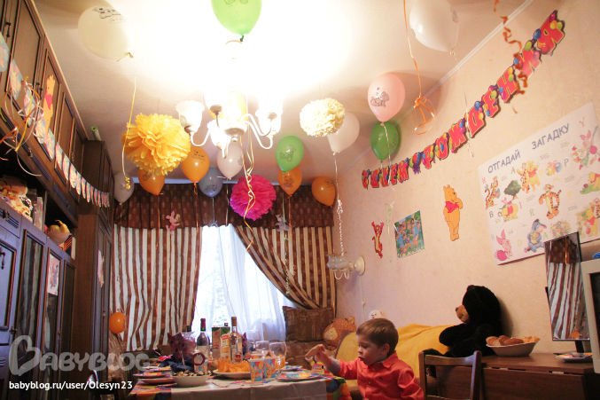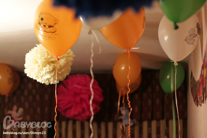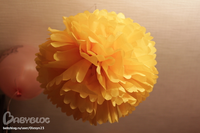 Прям как наше празднование первого Дня рождения дочери, шары, такая же растяжка на стене и цветы из бумаги я тоже первый раз делала :) Только плакат у нас был с каретой и голубями, и розовый цвет преобладал :) А цветы всем очень понравились и смотрятся оригинально.