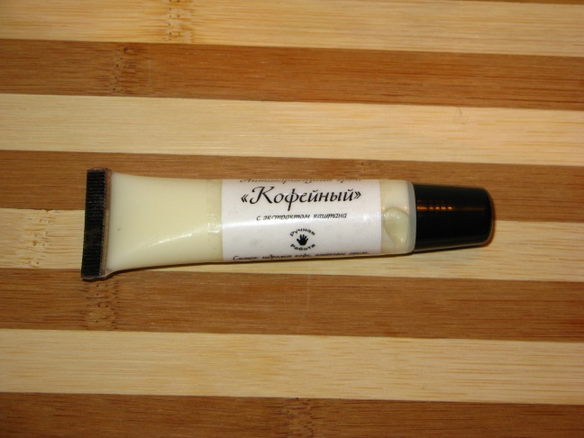 Состав: гидролат кофе, масло макадамии, оливковое масло, пальмоядровое масло, масло Ши, пшеничный эмульгирующий воск, сверхкритический СО2 экстракт конского каштана, витамины А и Е, микрокил.