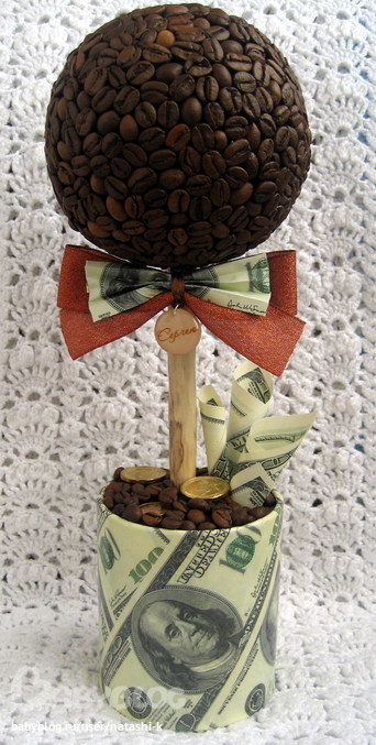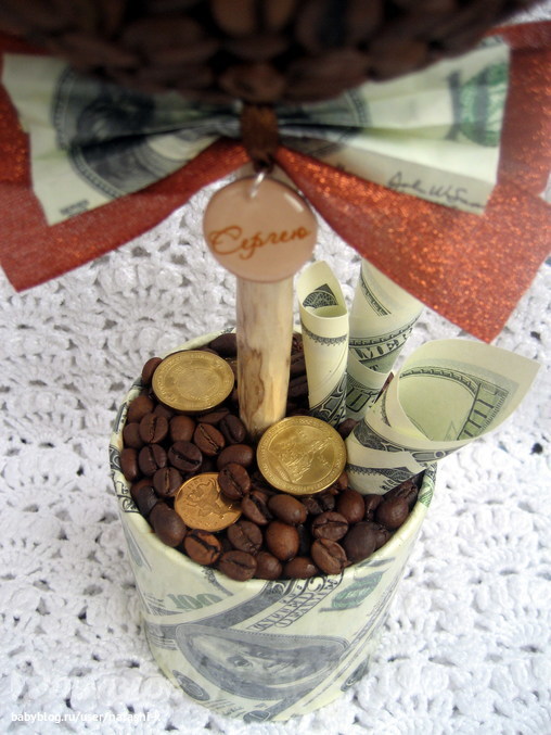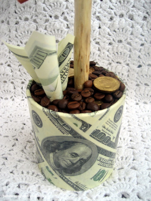 Купюры конечно сувенирные, а монетки в горшочке настоящие, юбилейные! Горшок.... не декупаж, конечно, но за основу брался этот принцип работы.