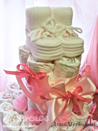 купила ленты подходящего цвета, приобрела упаковку подгузников (кстати,на торт ушло 72