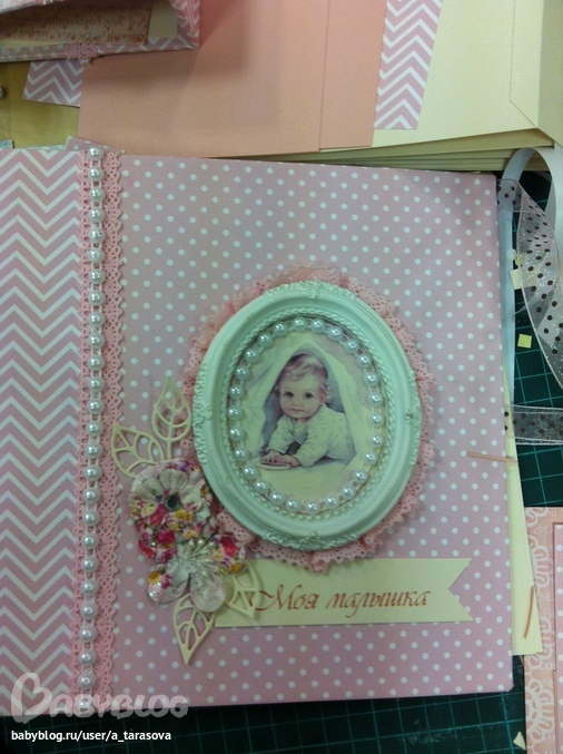 Сегодня в студии магазина Мемуарис мы делали детский альбом с нуля. Собрали переплет,сконструировали и оформили обложку,сделалаи несколько разворотов. Поработали с моей любимой гипсовой рамкой,кружевом и полужемчугом. Учились компазиционно оформлять внутренние листы.
