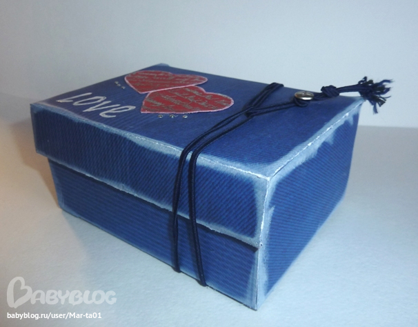 Решила сделать коробочку джинсовой.Бумага (как я думала) хорошая, дорогая, но подвела она меня... На изгибах лопнула, пришлось тонировать, получилось типа потёртых джинсов.Дааа, не всегда хорошо, то что дорогое.