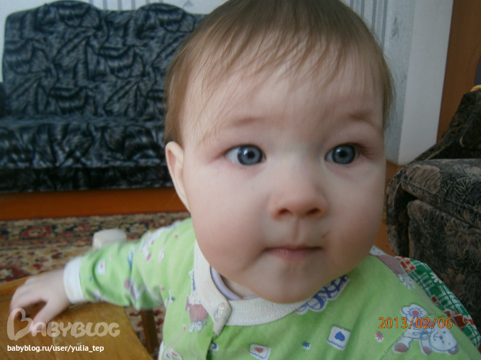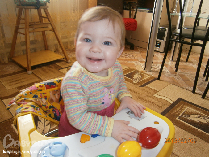 Ну и наши умелки: машем пока-пока, играем в ладушки, свободно ходим у опоры, дает что-нибудь на слово "дай", пытается бросать мячик. Все, что вспомнила. Зубов нет(