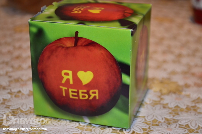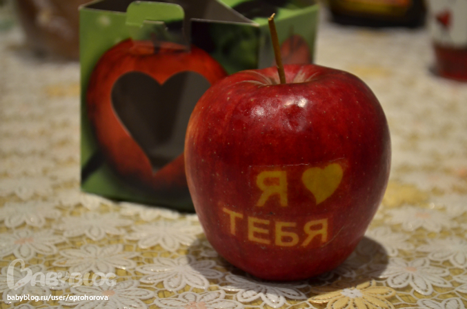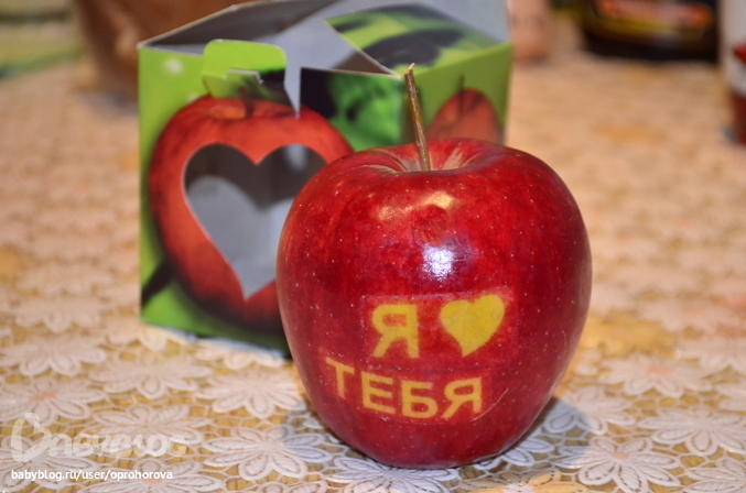 Ну на неспелое яблоко приклеивают наклейку-буковки "я тебя люблю". яблоко зреет, под солнышком становится красным, но сквозь наклейку солнечные лучи не проходят, поэтому и получается такая надпись. это как с купальником - сами загорелые, а титьки и попа белые )