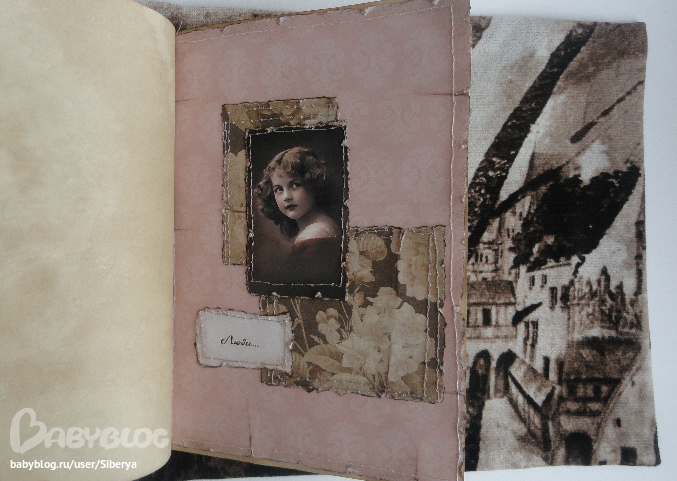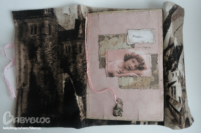 Итак, софтбук: два вида ткани (хлопок и нежнейший трикотаж с принтом "старый город". 70 тонированных в кофечае листов, коптский переплет, закладка - шнур с металлической подвеской, и два разделителя с милыми девчушками: