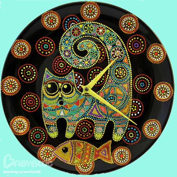Марина , все мои работы здесь http://magicpoints.ru . "Котейка" стоит 1800 р. Сделаны на керамической тарелке диаметром 27 см . Механизм плавный,бесшумный .