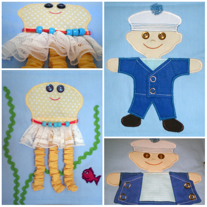 У медузы ноги растягиваются (внутри резинка). У морячка курточка застегивается на кнопки.
