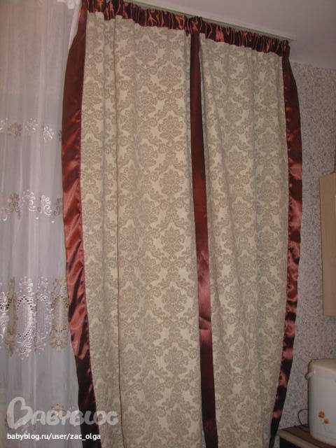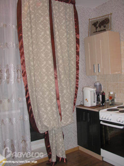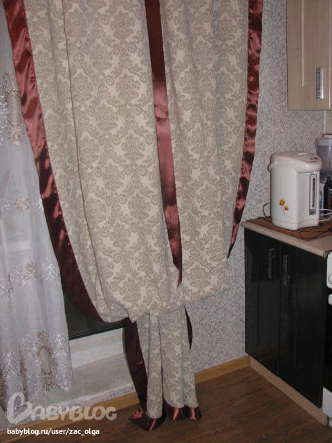 Коричневый атлас не смотрится на этих шторах и в этой кухне, как-то глаз на него смотрит, а не на ткань шторы ( хотя может это на фото так вышло). А ткань сама по себе очень красивая