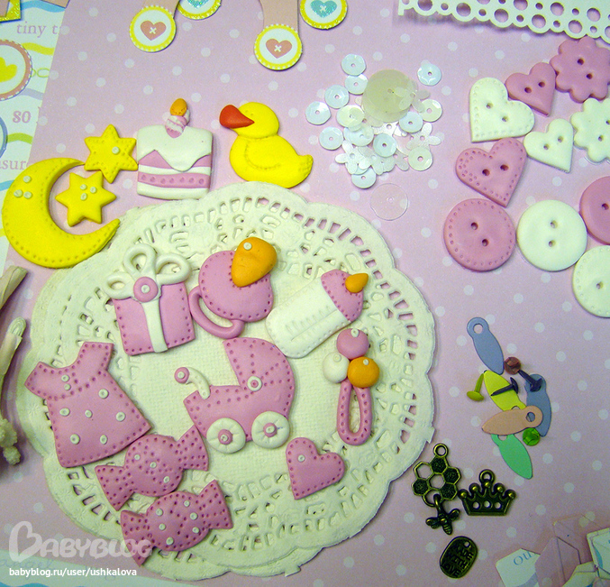 10 фишек ручной работы из полимерной глины + пуговицы к ним, пайетки, анкеры, 3 металлические подвески.