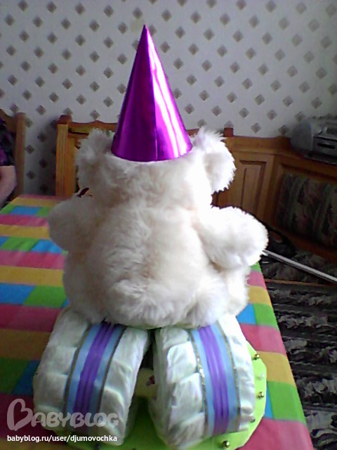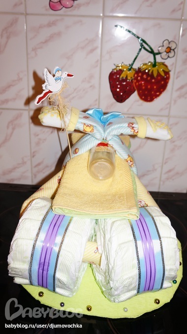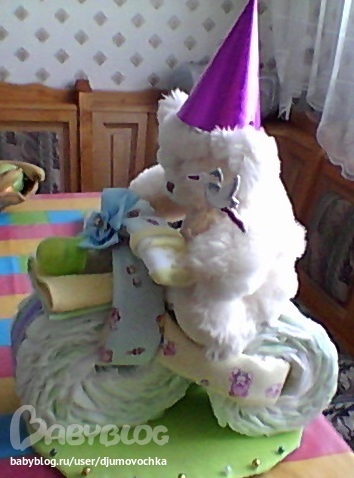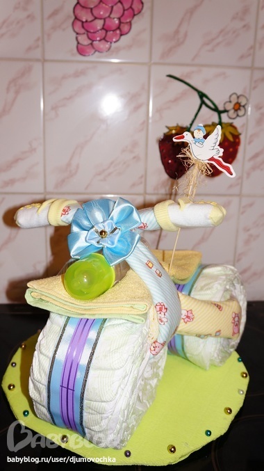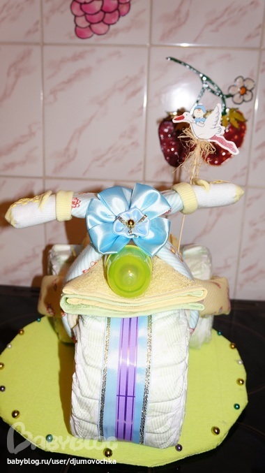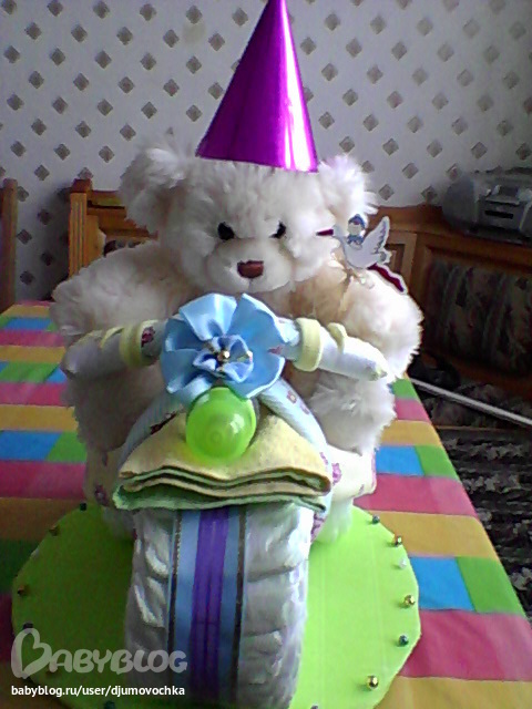 Делала в 2 этапа, дома сам мотоцикл, а у мамы дома уже посадила медведя и упаковала ;) поэтому фото разного качества, у мамы дома фоткада уже на телефон. Подарок был очень неожиданным и очень понравился родмтелям новорожденного