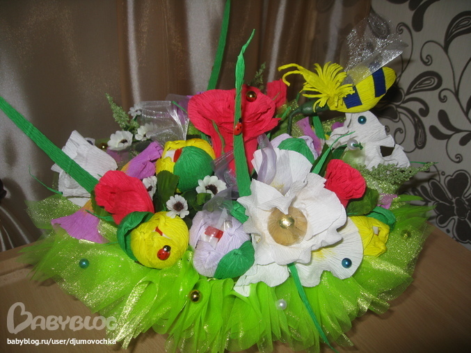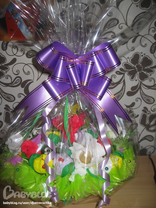 Такое буйство красок. У вас только зеленого 6 оттенков. Изменила бы - композицию, используемые конфеты, поищите палитру цвета, вам будет легче