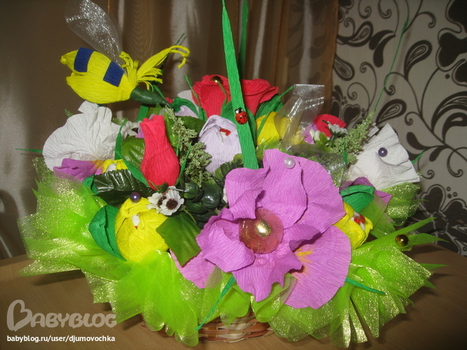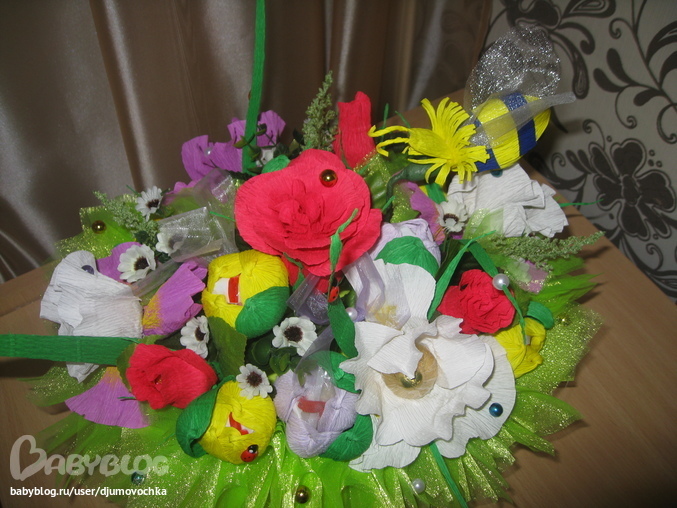 Это просто совет на будующий букет. А то, что он, новый букетик, будет -я не сомневаюсь! Пробуйте для начала взять вообще всего 2 цвета. Из тех, что у вас, я вижу, точно есть, например, красный и белый, или белый и сиреневый. Тогда при добавлении зелени все встанет на свои места! Что касается исполнения - розочки аккуратные, только чашелистники у бутончиков советую закрутить, они будут аккуратнее. Много разной зелени, и гофра, и органза, и от покупных цветов. Помоему лучше взять поменьше разной фактуры зелени. она будет тогда не самостоятельным элементом, а оправой для ваших букетов)) Удачи вам и не опускайте руки!!! У вас все получится.!!!