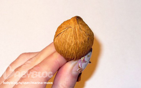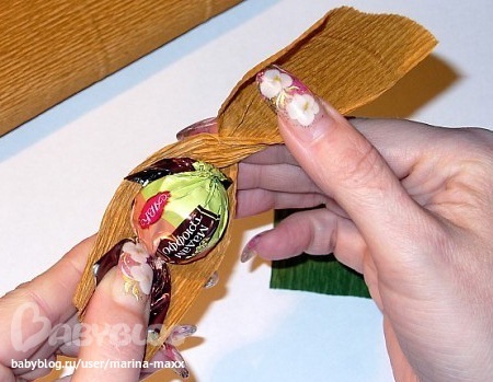 К сожаления, кончилась тейп-лента, пришлось выкручиваться с полосками гофры. И конфетки были в наличие только марсианка, поэтому, чтобы не было видно черных фантиков, оборачивала конфетки оранжевой бумагой (как орешки). В принципе, в природе сердцевинки у них оранжевые, но мне как-то приятней, когда красивые конфетки все-таки видны))