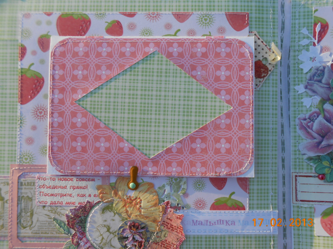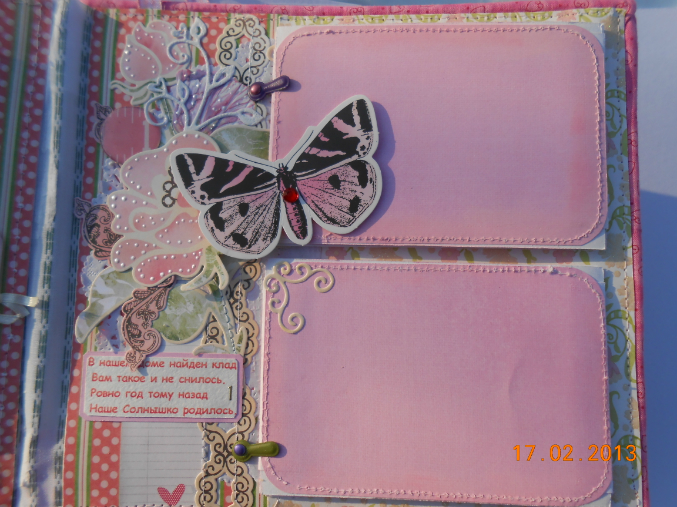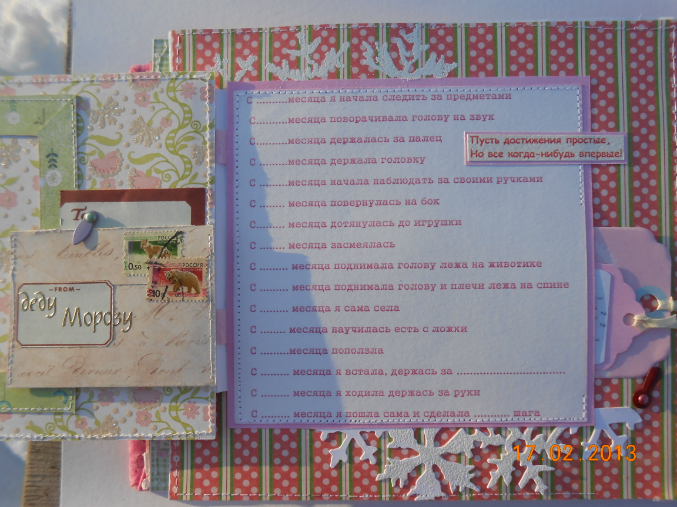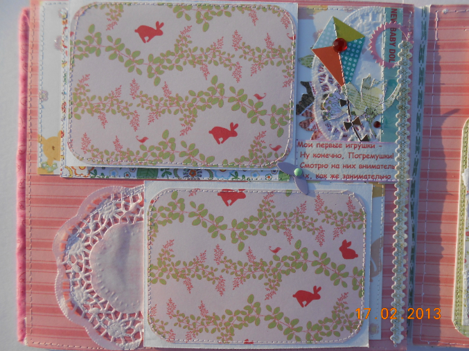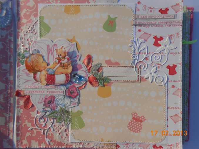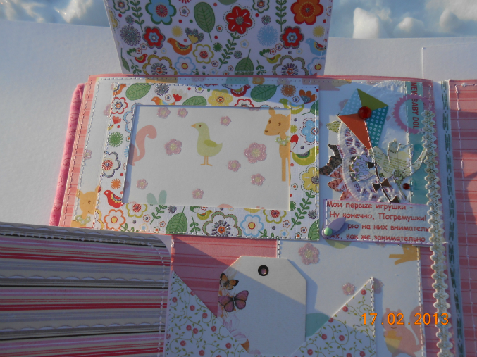 Альбом форматом 21*22 см, 6-ть листов, обложка мягкая тканевая. Переплет мягкий тканевый (по МК Нади Смилла). Рассчитан на 48 фото. В альбоме много тегов, и пара конвертов. Как всегда графики роста/веса, зубки и успехи малышки.