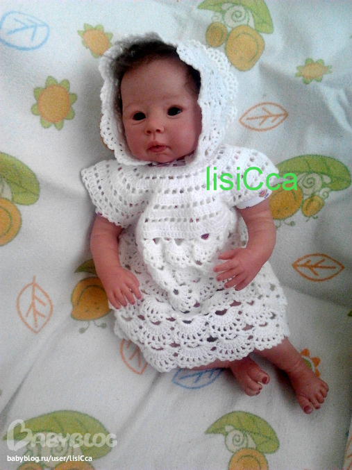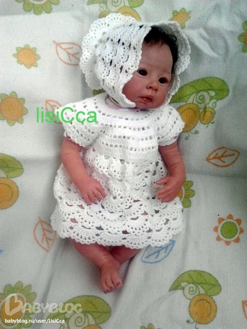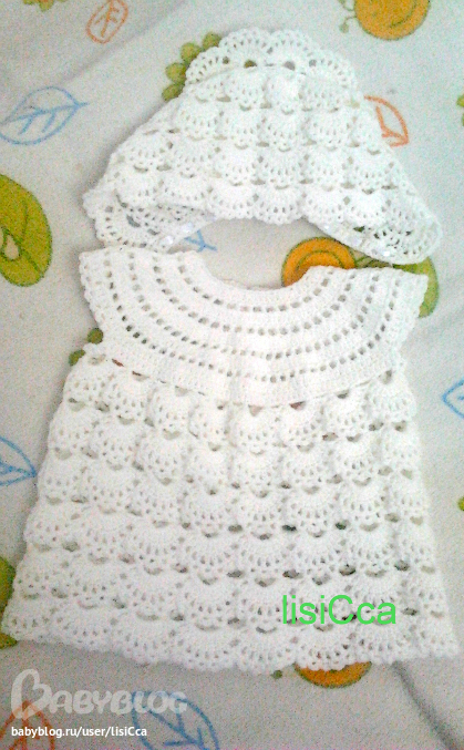 Нежный и воздушный комплект для маленькой принцессы состоит из чепчика и платьица. Идеально подойдет как подарок на рождение или на выписку. Выполнен крючком из детского акрила, мягенький =)