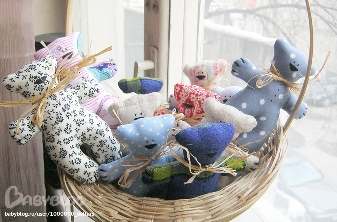 каждая мишка по разному получается, за счет ткани, глазок, даже бантики...