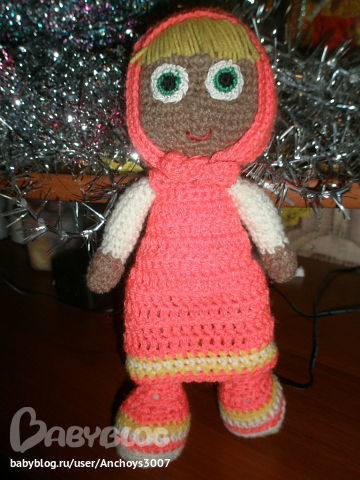 Игрушечный мир - животныеДочка любит очень мультик "Маша и медведь", вот решила связать ей Машу, описание нашла в инете, правда ниток телесного цвета не было и получилась вот такая загорелая Маша))))