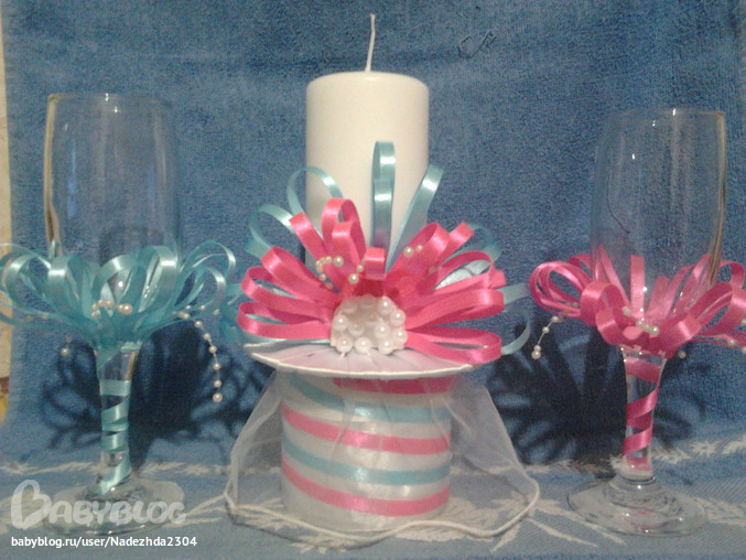 вот я и сделала свой первый компелкт на свадьбу! В этот комплект входят свечи для мам (к сожалению нет фотки, и замок с казной не сфотографировала - растяпа), "семейный очаг", бокалы и бутылки на тол молодых.