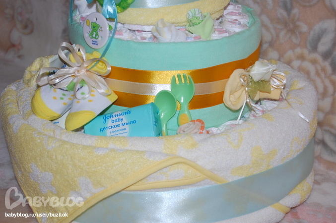 В тортик вошли 3 пелёнки, уголок для купания, чепчик, царапки, 4 пары носок, прищепка для соски, прорезыватель, пинетки, крем под подбузник, детское мыло, рукавица для капания, первая ложечка и вилочка, много японских памнерсов... И моя любовь и забота о сестре и ее сыночке.