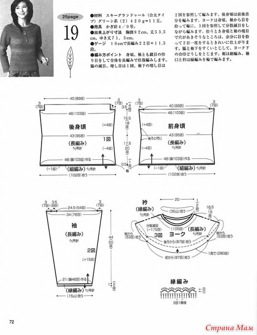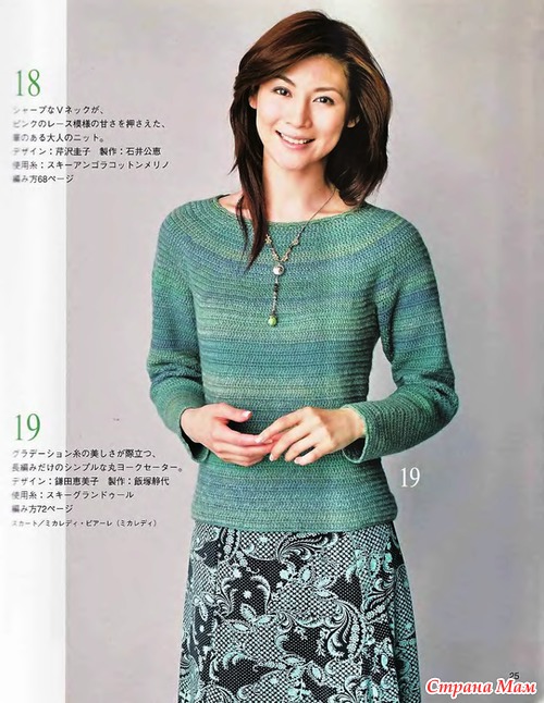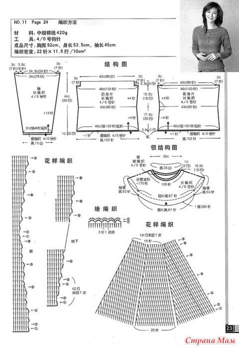 Лучше всего для начала выполнить выкройку в натуральную велечину, можно взять за ореентир похожую вещь из своего гардероба (лучше приталенную, можно без кокетки). После выкройки начинайте вязать кокетку. Наберите цепочку нужной длины (длину определите примеркой, какой хочете вырез - поглубже или поменьше). Там над схемой кокетки цифра 15 кажется (плохо видно) - это, по идее, число петель одного раппорта. Это значит, что колличество петель начальной цепочки должно быть кратно этому числу (для равномерных прибавок). Потом вяжете кокетку по схеме, примеряете на себя, прикладываете к выкройке. Когда дойдете до пройм, нужно вязать отдельно рукава и отдельно спинку и перед. Поскольку дана схема приталивания, то лучше вязать отдельно спинку и отдельно перед, а потом сшить. Приталивание я бы делала ориентируясь только на собственную выкройку (нужно прикладывать), рукава так же.