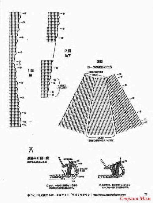 Вяжется столбиком с одним накидом. Про выкройку точно не знаю, почему именно так. Но мне. кажется, что это спереди для груди. Но я не уверенна. Там и на второй выкройке похожее что-то отмечено, но без уголка. Не знаю, что цифра 7 значит, но там написано еще 3,5 (4) см (думаю что это и есть проймы рукавов). Правда не очень в этом уверена