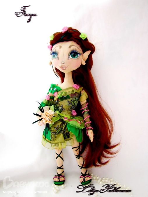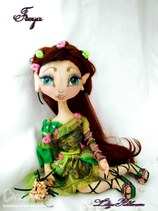 Очень мне хотелось сшить девочку Майю( одну из трёх богинь весны) Но в процессе появилась вся такая майская, весёлая, яркая девочка эльф. Фрейя очень любит свой сказочный лес. Ведь все в нем живут дружно и с песней на устах.А помогает ей следить за порядком Зайка MOzayka.Но это уже другая история....